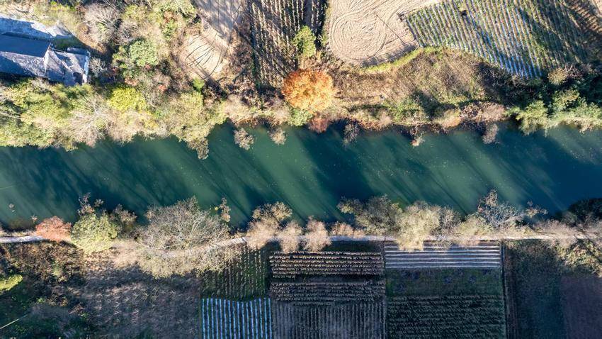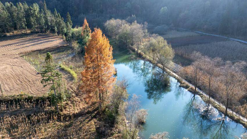 董家河如一条深绿丝绦,静静萦绕在村落间。岸边未凋零的树木将枝叶探向水面,橙红的槭叶、墨绿的松针、金黄的银杏叶交织成彩帘,风一吹,叶片便打着旋儿落入河中,随水流缓缓漂向远方,像是大自然写给冬日的信笺。